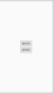 음악 서비스 예제를 다루어 보겠습니다. 버튼 클릭 시 음악 시 시작되며 화면이 종료되어도 음악이 계속 흐르는 서비스를 만들어 보겠습니다. 일단 프로젝트를 하나 생성 후 간단하게 xml를 구성하겠습니다 버튼 두 개를 만들어 시작과 중지를 만들면 되겠습니다.