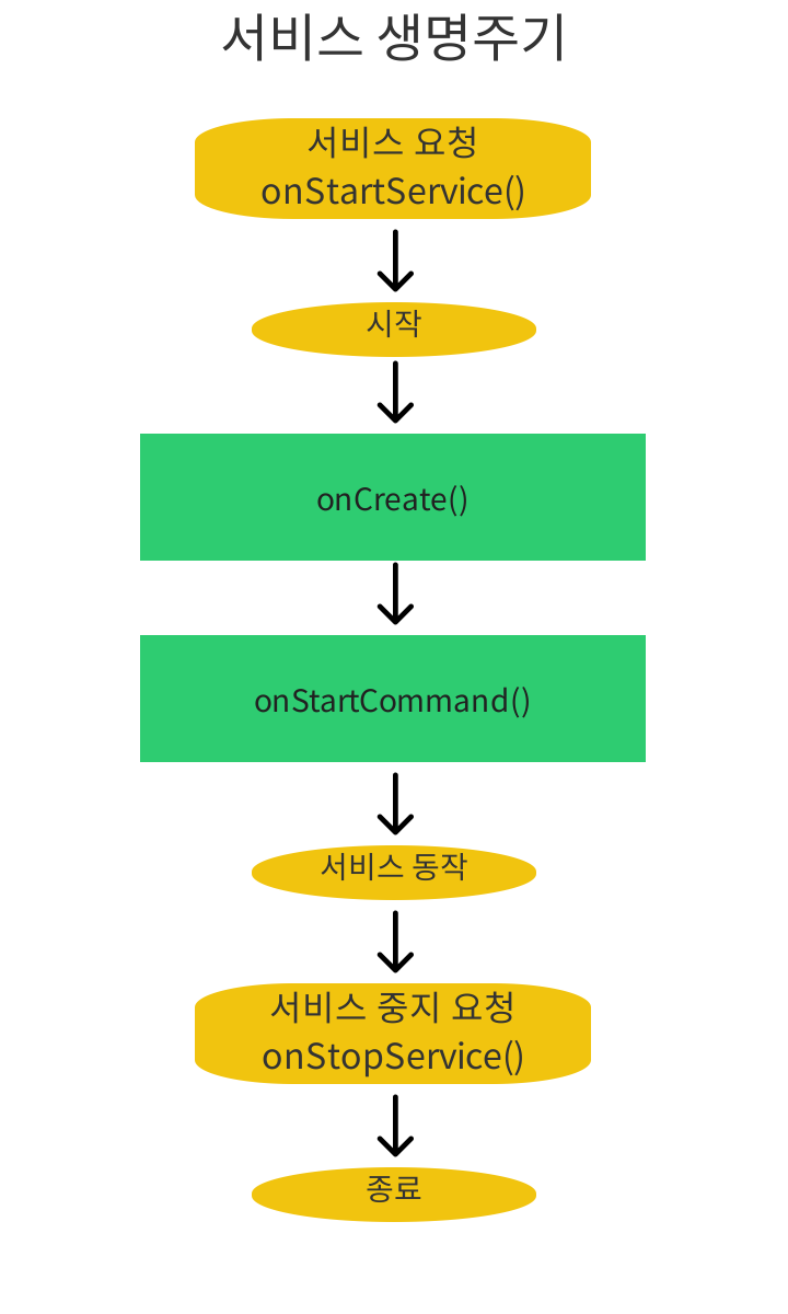 서비스(Service)는 일반적으로 화면 없이 동작하는 프로그램을 말하며, 다른 말로는 데몬(daemon), 또는 백그라운드 프로세스(background process)라고도 한다. 액티비티나 응용 프로그램은 화면이 종료되면 동작하지 않지만 서비스는 백그라운드에서 실행 되므로 화면과 상관없이 계속 동작한다